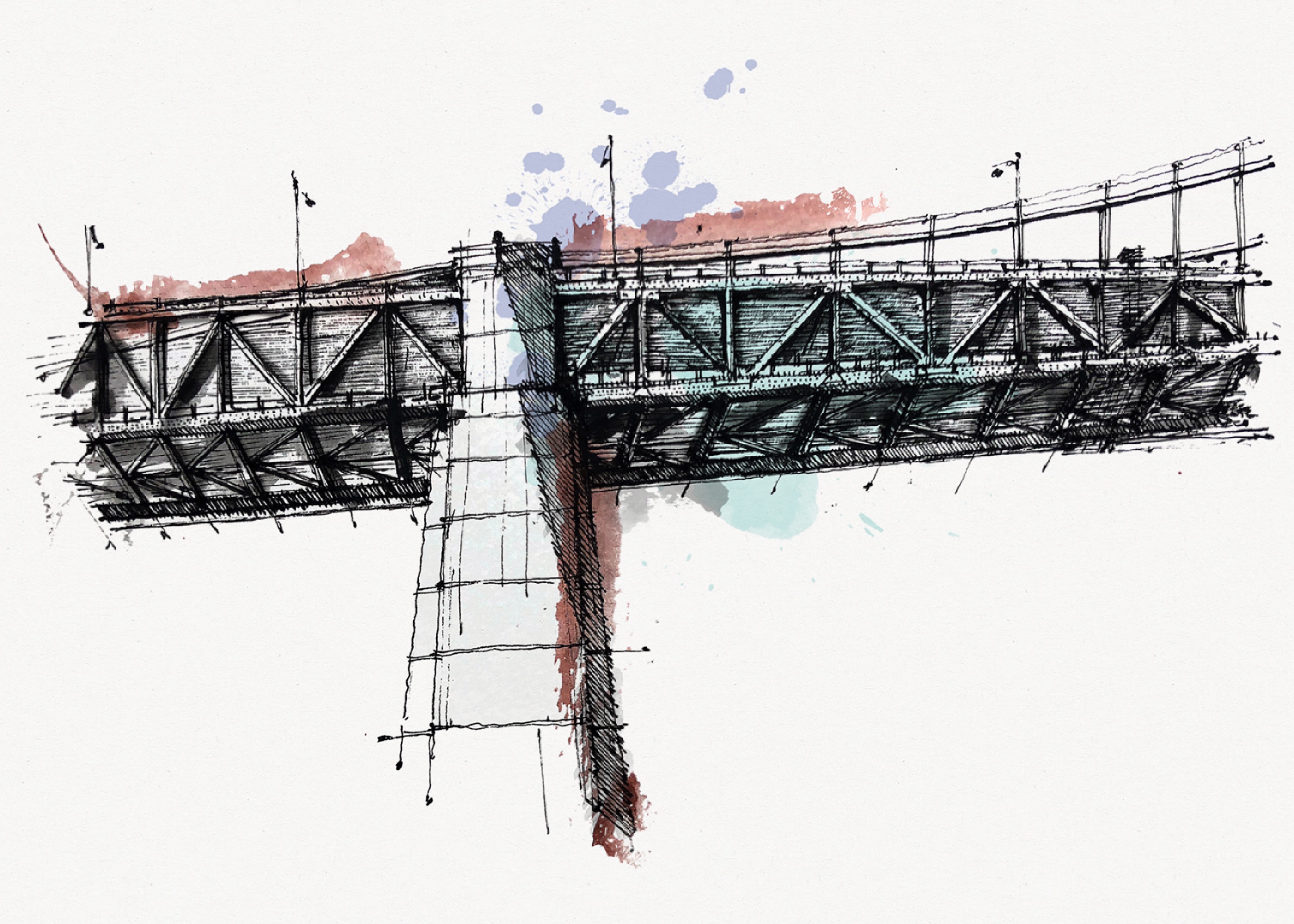 I opened my sketchbook. Pulled out my handy Micron (.02) pen and small Sakura watercolor set that are always with me. I started sketching the structure of the beautiful Bay Bridge right next to me with the reflection in the water.